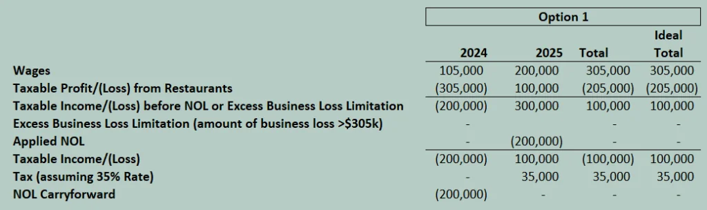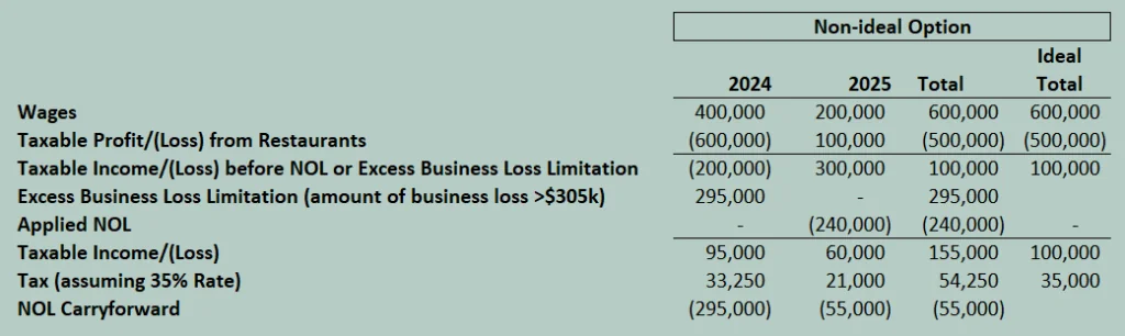 So what can you do to plan appropriately? It depends on the choices that are on the table at the time, but here are a few things Jane could have done. First, she could have lowered the management fee that her management company charges her restaurants to reduce the overall losses of the restaurants to $305,000 (the threshold for EBL in 2024). This assumes the management company is a break-even operation after paying the owner’s wages. Here is the impact that would have: