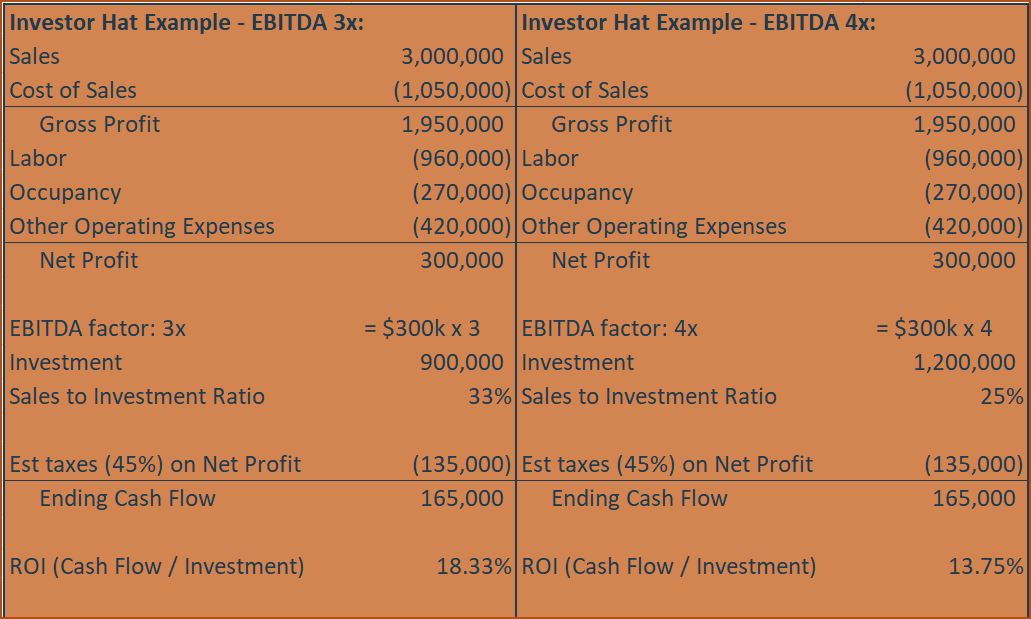 Let’s put our investor hat on and see why 2-4x is an ideal EBITDA multiple for investors. Assume a restaurant generates $3m in sales and $300k in EBITDA. Assuming all the factors above are neutral, a 3x EBITDA valuation would yield a yearly return of 33% ($300k EBITDA / $900k investment) before taxes. The investor would have to pay about $135k in taxes (45% estimated federal and state income tax rate multiplied by $300k EBITDA) on this income, thus giving them a cash flow of $165k. $165k divided by the $900k investment equals an 18.33% return. This is a fair percentage of return that an investor is willing to accept for such a risky investment. If the restaurant is less risky, for instance, it might have a 20-year track record with no expected changes in the market; then the investor might be willing to offer 4x EBITDA. 4x EBITDA using the example above means they would invest $1.2m for the same restaurant and receive $165k in cash flow after taxes each year, which is a 13.75% return ($165k divided by the $1.2m). Offering 4x EBITDA is rare, but it’s still not a bad deal for the investor, especially if they have a complimentary or supplementary business plan for the restaurant. This is how credible investors think. This is how they assess restaurant investments. It helps to think like one when building your restaurant empire.